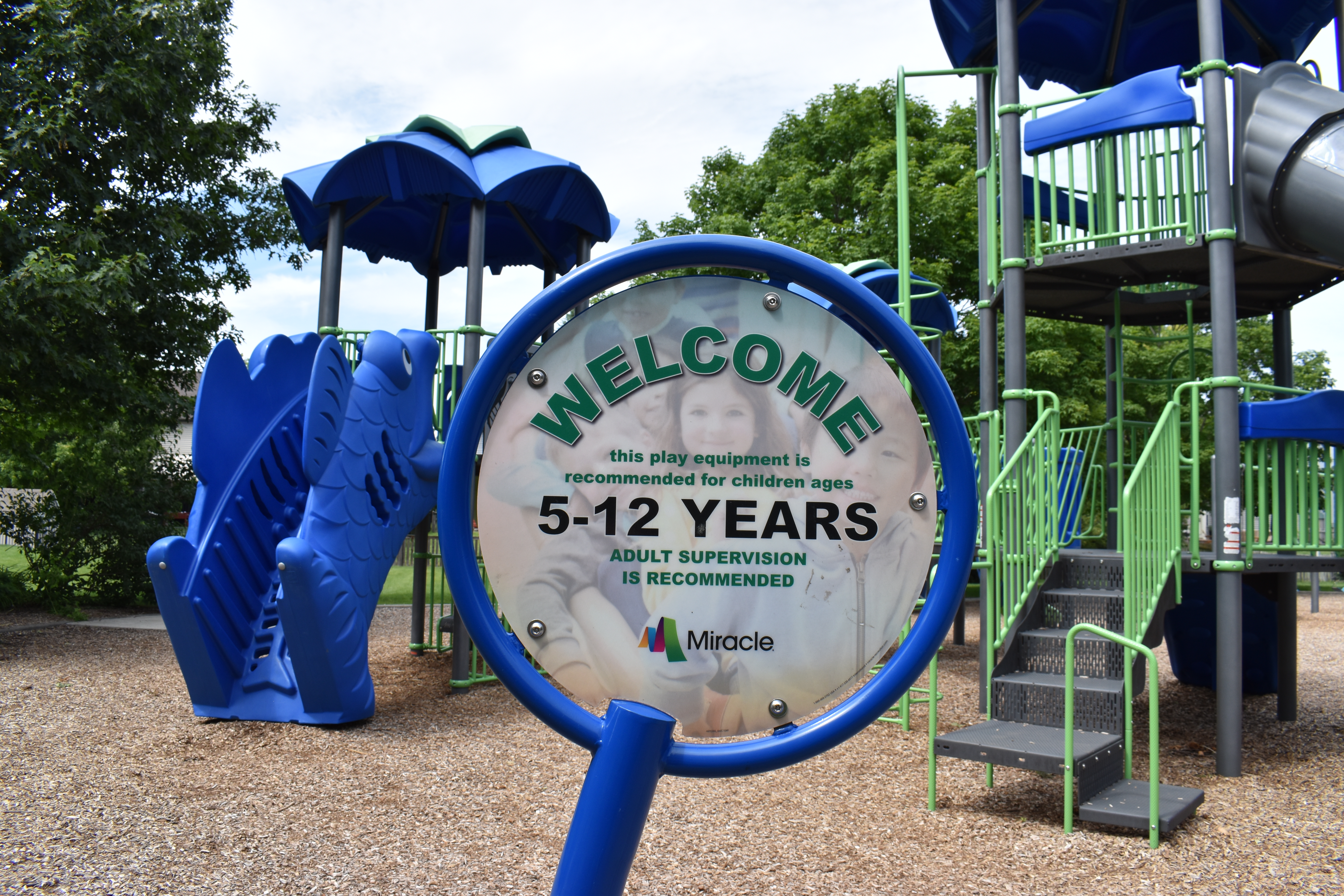 The playground is broken off into two playsets, one is geared towards children aged 2-5 years and the other is geared towards children aged 5-12 years. The playgrounds both feature age appropriate slides and climbing structures with accessible swings.